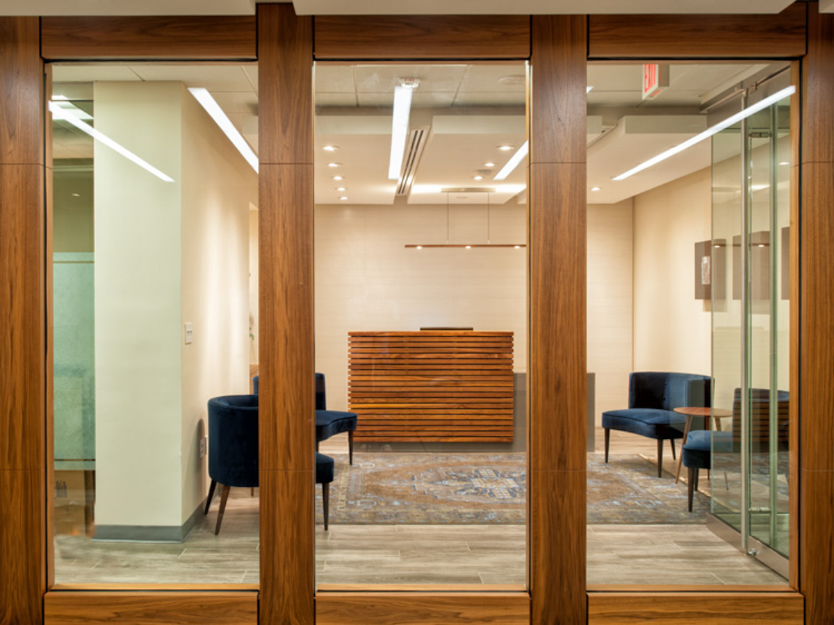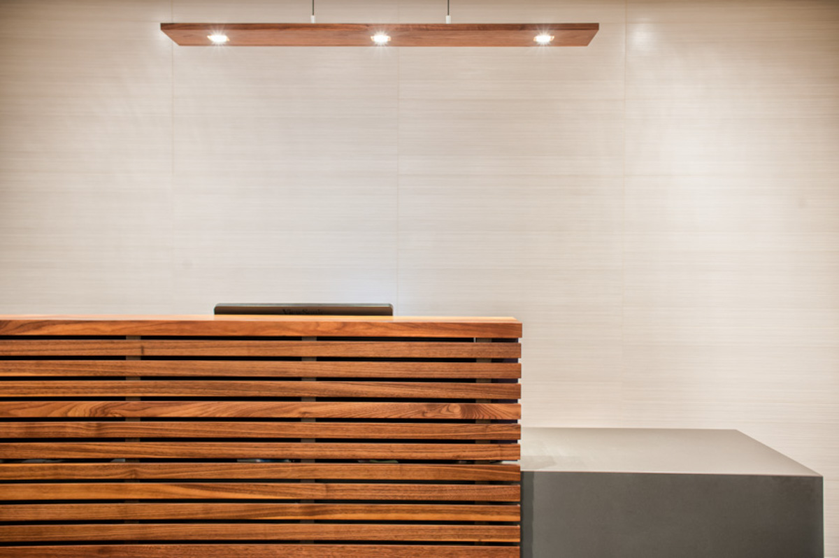 Warmth, texture, and depth are further carried through the firm’s space by wide floor-to-ceiling wood frames that highlight the reception and the adjoining conference room. The large glass panels add spaciousness to the office, while embellishing the atmosphere with a feeling of activity, brightness, and transparency.