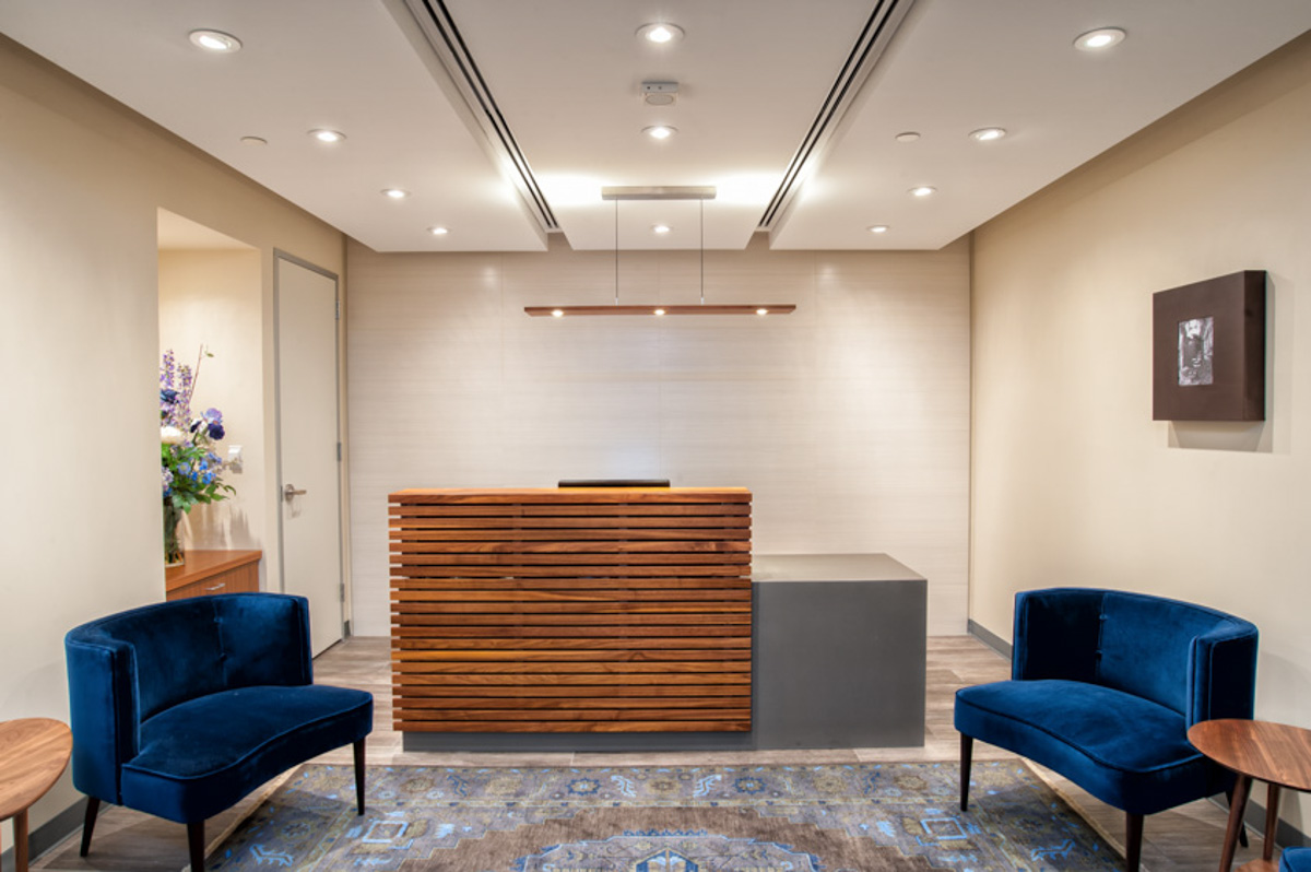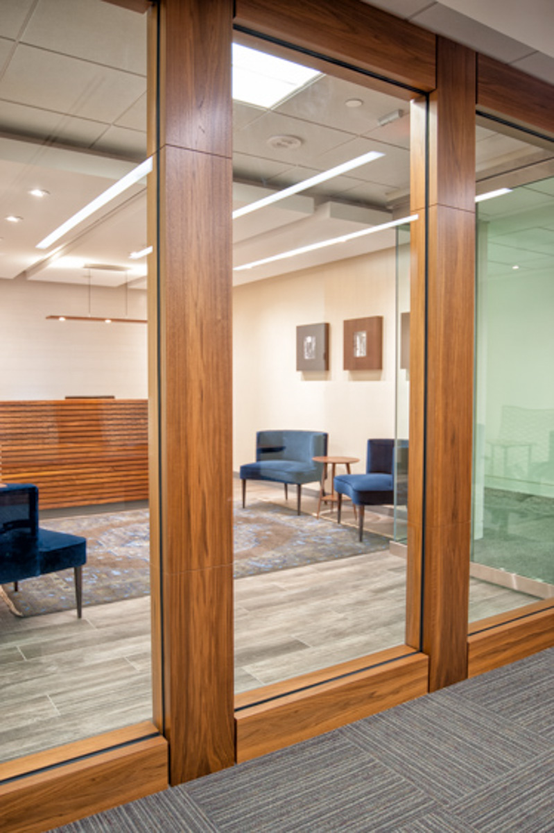 The use of wood in the reception desk immediately brings warmth to the room as a visitor is greeted with a taste of the natural world. The desk is accented by a modern wood chandelier, and the room’s inviting environment is enhanced further by integrated lighting, linear and integrated supply grills, and a floating ceiling.